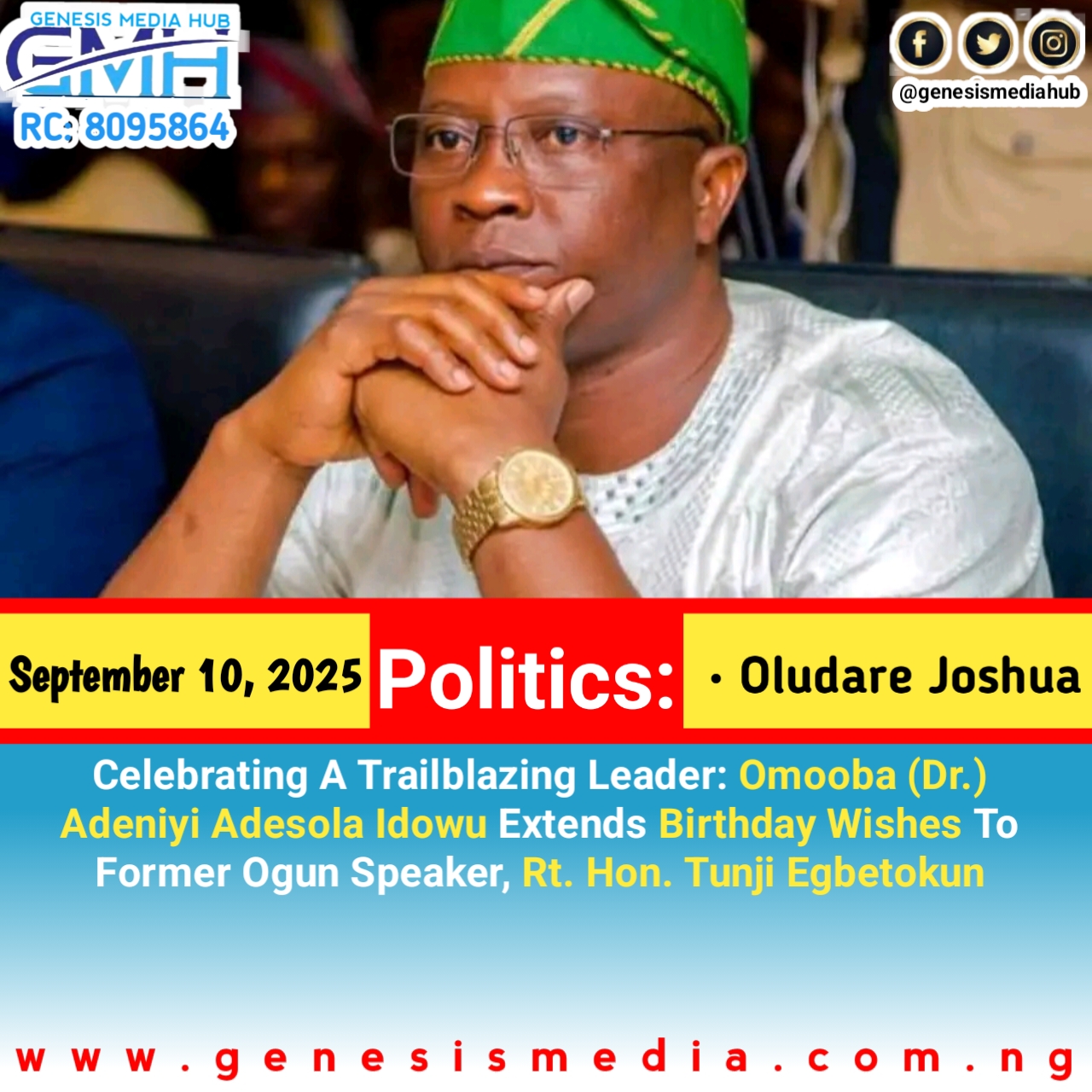 Today marks a special day for a true leader and statesman, Rt. Hon. Tunji Egbetokun, as he celebrates his birthday. As a highly respected figure in the political landscape of Ogun State, Egbetokun has made significant contributions to the development of his community and the state as a whole. And on this momentous occasion, Omooba (Dr.) Adeniyi Adesola Idowu, FEIPA, joins in the celebration and extends heartfelt congratulations to the former Ogun Speaker.