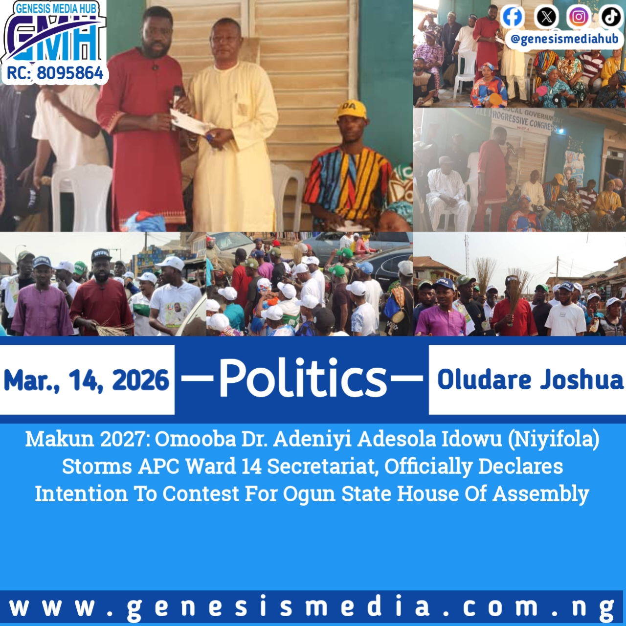 ‎In a significant political development that signals the beginning of an ambitious journey toward purposeful representation, Omooba Dr. Adeniyi Adesola Idowu, FEIPA, popularly known as Niyifola, a prominent son of the soil, philanthropist, entrepreneur, business tycoon and renowned grassroots politician, on Friday, March 13, 2026, officially declared his intention to contest for the position of Member, Ogun State House of Assembly, to represent Sagamu II (Makun) State Constituency under the platform of the All Progressives Congress (APC).